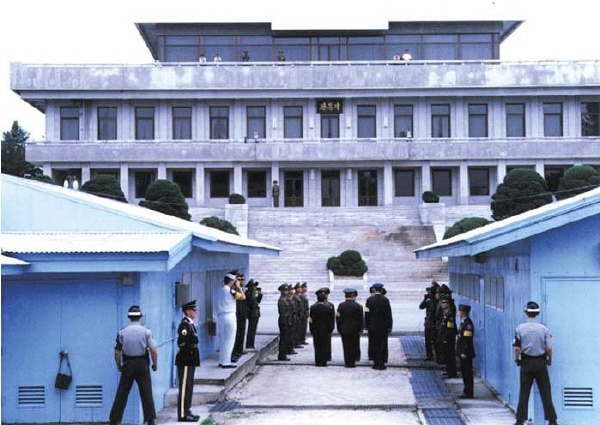 군사정전위원회 회의실은 정전협정 체결 후 현재 판문점 위치를 공동경비구역으로 설정하고, 군정위 기구들이 회의실로 사용하기 위해 군사분계선 위에 가건물 7개동을 설치하였습니다. 그중 회색 4개 동은 북한 측이 관리하고, 가운데 하늘색 3개 동은 유엔사측이 관리하는 건물입니다.